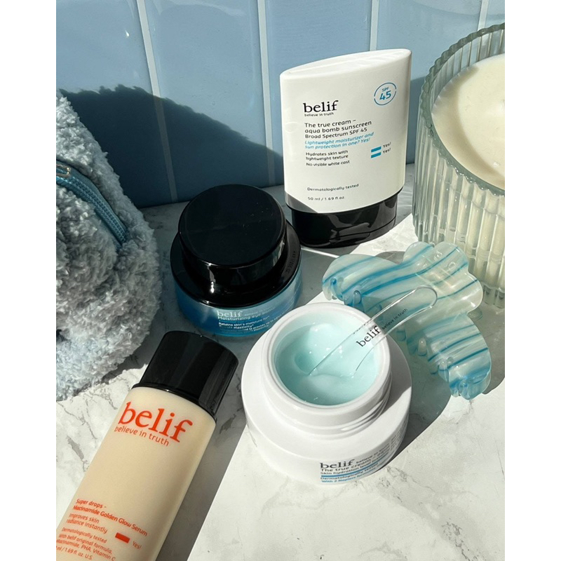 - Công thức Belif nguyên bản gồm: khuynh diệp, quả tằm xuân, bạc hà táo, tía tô đất, cỏ xạ hương và hương thảo giúp dưỡng ẩm, làm dịu và kháng viêm cho da và tăng cường đàn hồi