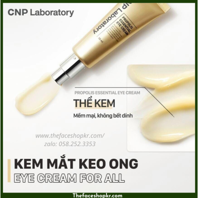 - Với công thức gel-in-cream, kem mắt keo ong CNP có kết cấu mịn màng, nhẹ nhàng thấm vào da để nuôi dưỡng vùng da mỏng manh, nhạy cảm quanh mắt.