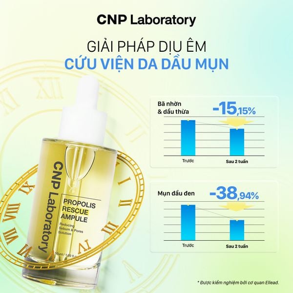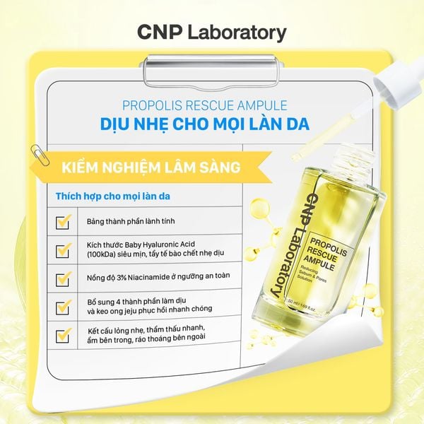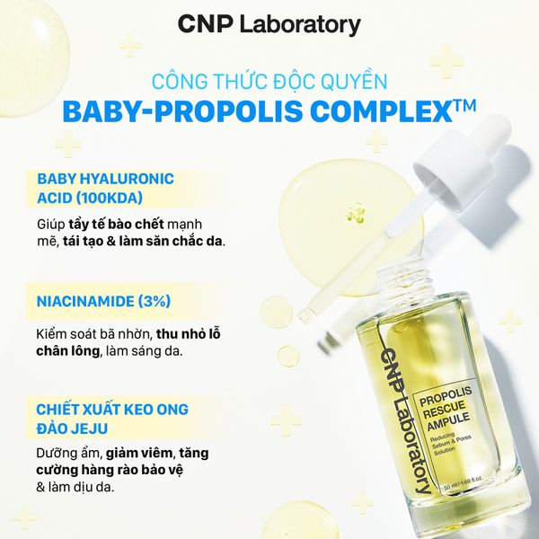 Tinh chất keo ong CNP Propolis Rescue Ampule hỗ trợ "giải cứu" làn da nhiều vấn đề với thành phần độc quyền Baby Propolis Complex, hỗ trợ loại bỏ tế bào chết, kiểm soát bã nhỡn và làm dịu da chỉ trong 1 bước serum.