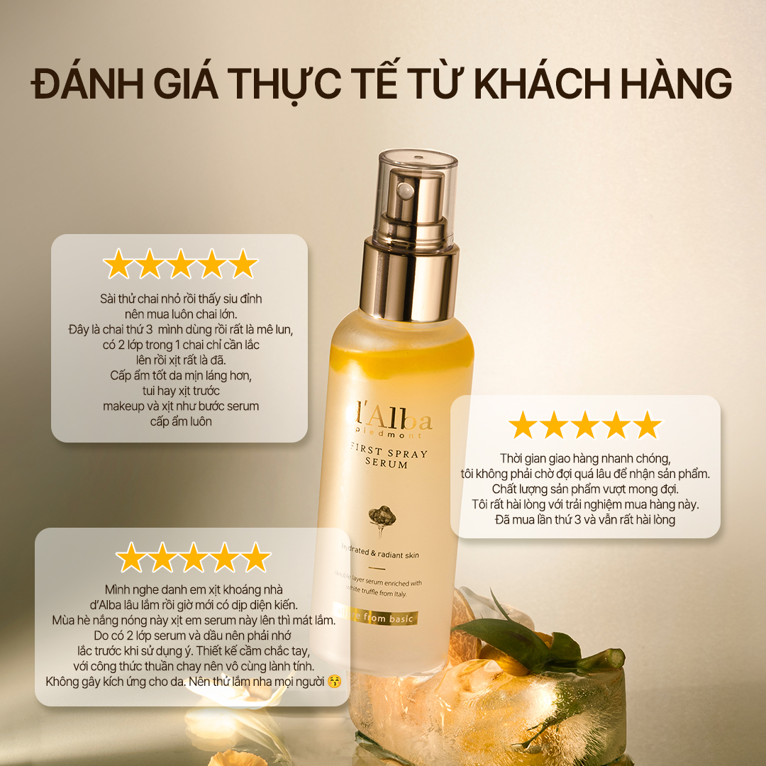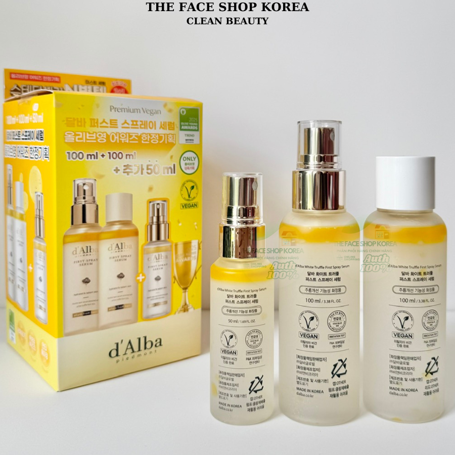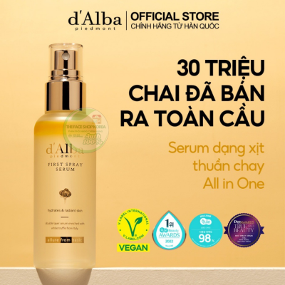 1. Với hơn 50 triệu chai xịt khoáng được bán tại Hàn Quốc, First Spray Serum đã trở thành sản phẩm Tinh chất Xịt khoáng bán chạy nhất trên 120 cửa hàng mỹ phẩm, giành được tiêu đề sản phẩm được yêu thích nhất trong nhiều tạp chí làm đẹp; xuất khẩu đến hơn 15 quốc gia trên thế giới. Nhờ sự đánh giá cao của các Sao Hàn Quốc, thương hiệu d'Alba đã nhận được hơn 51.000 nhận xét trên trang web chính thức về sản phẩm dạng xịt này và liên tục được tái tạo để phản hồi. Đáp ứng các nhu cầu tuyệt vời từ người tiêu dùng.