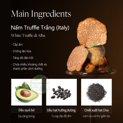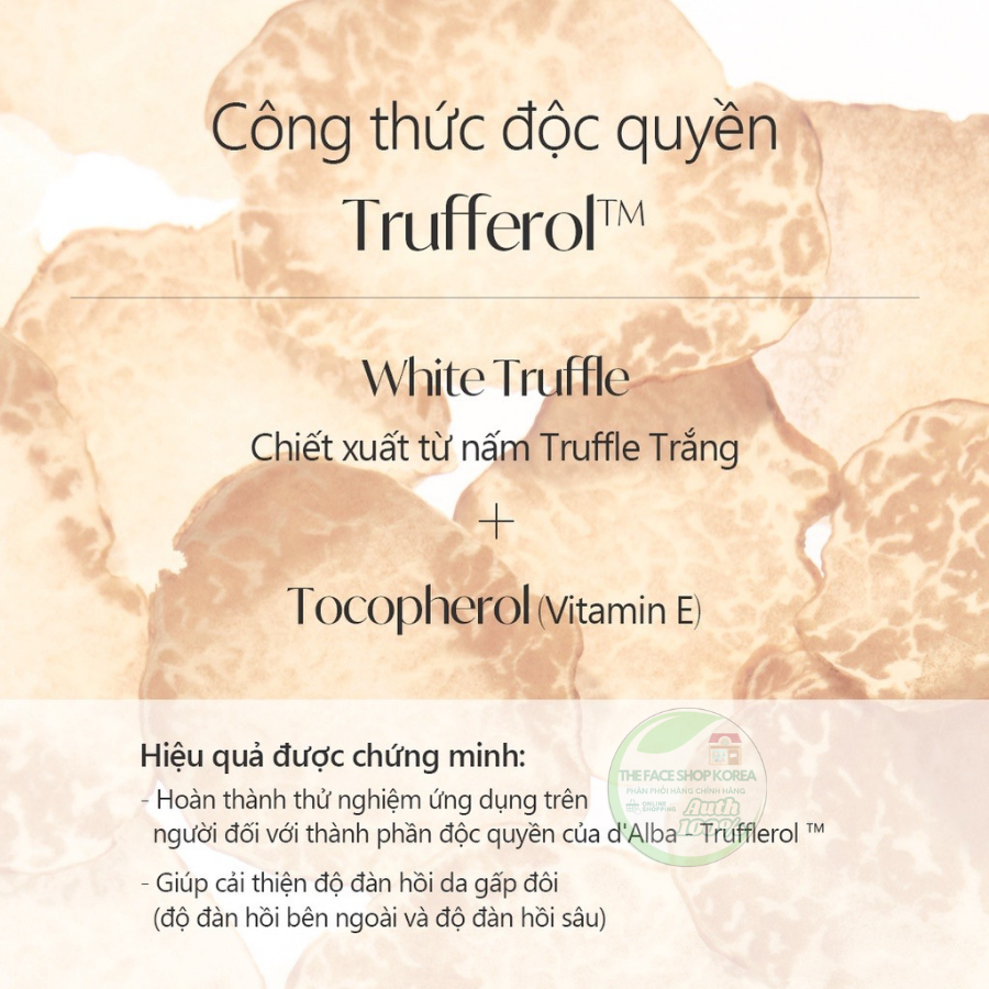 Thành phần chính: Thành phần chính: Nấm Truffle trắng - loại nấm quý hiếm và đắt nhất thế giới được nhập khẩu từ Piedmont, Ý - giúp cung cấp khoáng chất và dưỡng chất dồi dào cho làn da của Bạn. làn da của bạn. Piedmont là một trong những di sản thế giới được UNESCO công nhận. Khác với những loại nấm khác, nấm Truffle trắng yêu cầu quy trình chiết xuất đặc biệt, quy trình mà d'Alba cam kết đảm bảo an toàn.